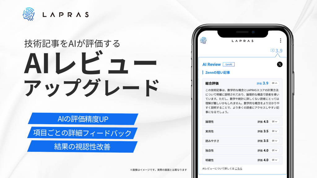 ※1:LAPRAS社内での評価検証の結果(QiitaおよびZennの技術記事合計10件をエンジニア3名により評価した結果の平均値と、AIレビューによる評価3回の平均値とを比較評価した結果による)