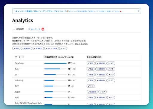 LAPRAS株式会社(所在地:東京都渋谷区、代表取締役:染谷健太郎 以下、LAPRAS)は、ハイスキルITエンジニア向け転職サービス「LAPRAS」において、Analytics機能のアップデートを実施しました。本アップデートにより、企業がどのようなキーワードで検索しているのかという市場動向を把握できるほか、自身のプロフィールがどのようなキーワードで見られているのかを確認できるようになりました。