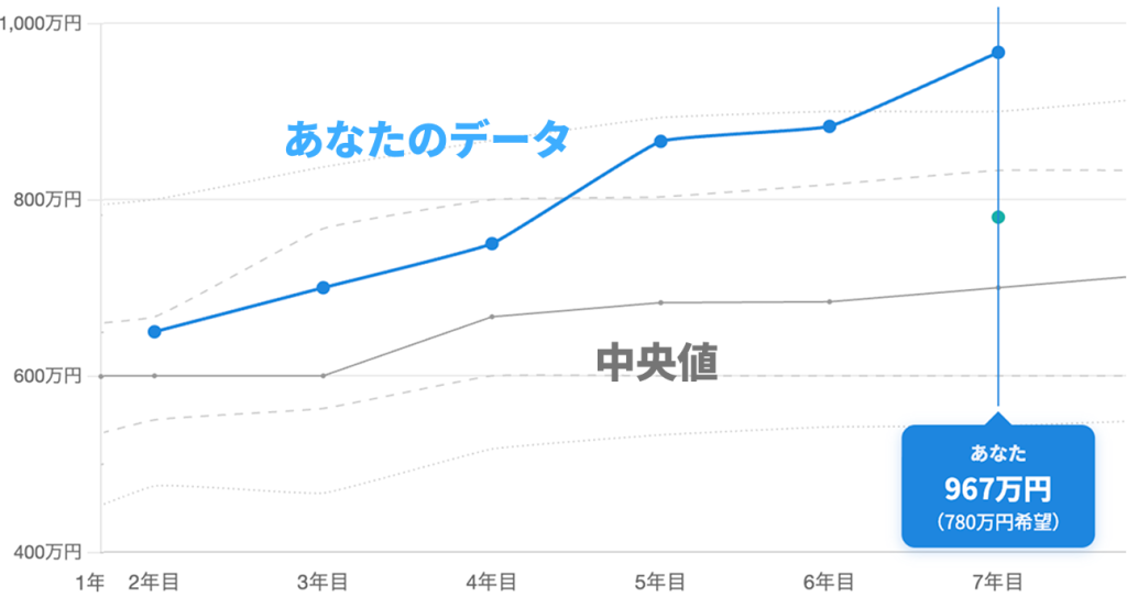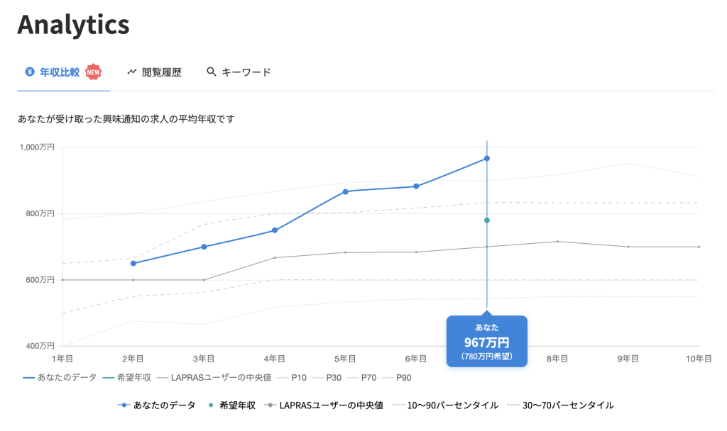グラフの横軸は「エンジニア経験年数」、縦軸は企業から受け取った「興味通知の提示年収」となっており、LAPRASユーザー全体の年収データがパーセンタイル(上位25%、中央値、下位25%など)の折れ線で示されます。ユーザーは、自身のプロットがグラフ上のどこに位置するかを見ることで、同じ経験年数の他のユーザーと比較して、自身の市場価値がどのあたりにあるのかを直感的に理解することができます。