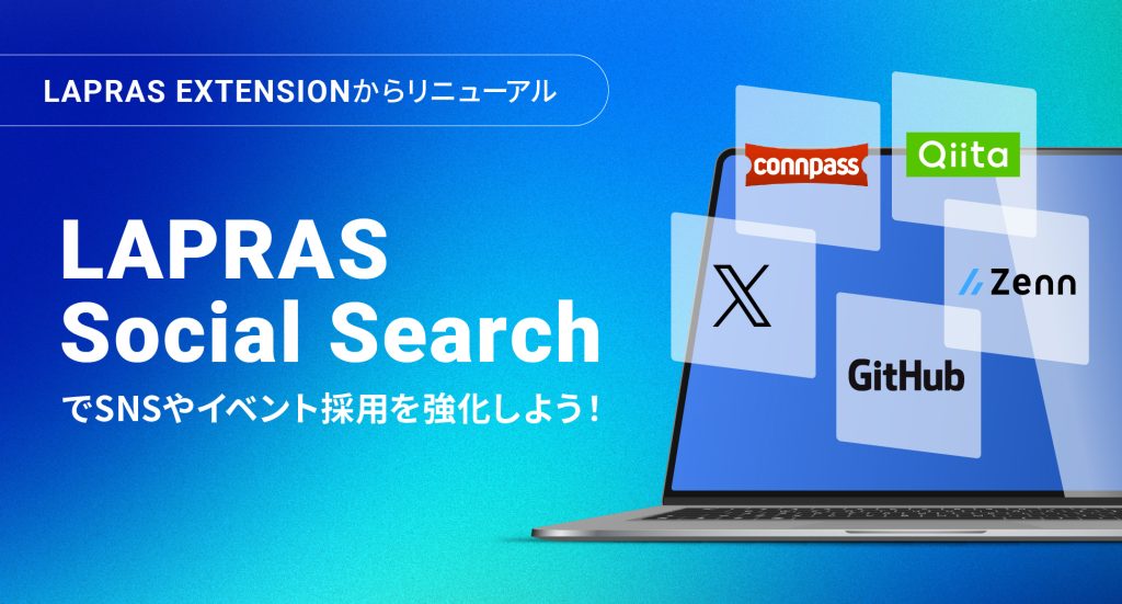 そしてこの度、SNS・イベント採用の支援ツールとしてご活用いただいていた「LAPRAS EXTENSION」を、「LAPRAS Social Search」へと名称変更いたしました。これにより、より多くの企業様のSNS・イベント採用を支援できるよう、機能を追加し、サービスを強化しました。