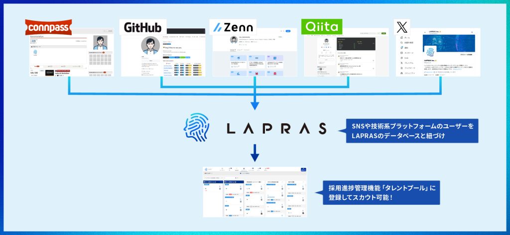 「LAPRASリクルーティング」では、これまでGoogle Chrome拡張機能「LAPRAS EXTENSION」を通じて、GitHub、Qiita、Zenn、Xなどの外部プラットフォームでの活動と、LAPRASのプロフィール情報を紐づける機能を提供してきました。