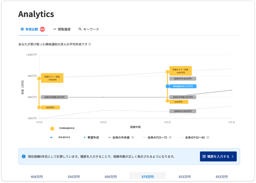 これにより、ユーザーはまだ企業から興味通知(スカウト)を受け取っていなくても、職歴を入力・充実させることで、自身の「予測オファー年収」をグラフで確認できるようになります。職歴を詳細に入力するほど、予測の精度が向上し、より実態に即した「予測オファー年収」を得ることが可能です。