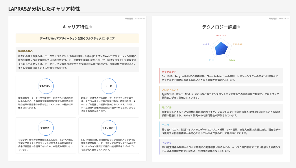 今回の機能公開により、これまでエンジニア向けに提供していたエンジニアの総合力を可視化する指標である「キャリア市場価値」を、企業の採用担当者にも最適化した形で表示できるようになりました。 LAPRASが保有する独自データをAIが多角的に解析し、まるで熟練の人材エージェントが候補者の強みを整理して推薦するようにサービス上で可視化します。