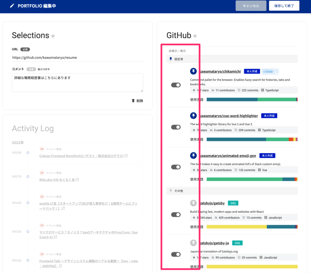 GitHubのリポジトリ*2の表示、非表示を選択可能です。また、一番見せたいリポジトリをピン留めし最上部に掲載することも可能です。これにより、自分が見せたいものを確実に見せることができます。