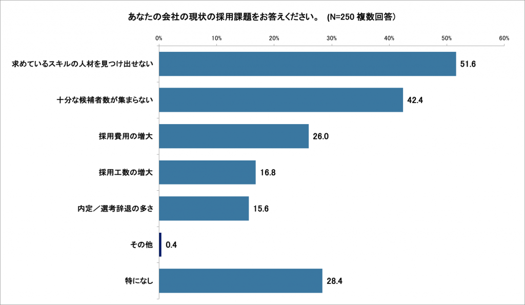採用活動における課題で最も多かった回答は「求めているスキルの人材を見つけ出せない」で51.6%でした。続いて「十分な候補者数が集まらない」が42.4%と、3位の「採用費用の増大」(26.0%)を大きく引き離しました。