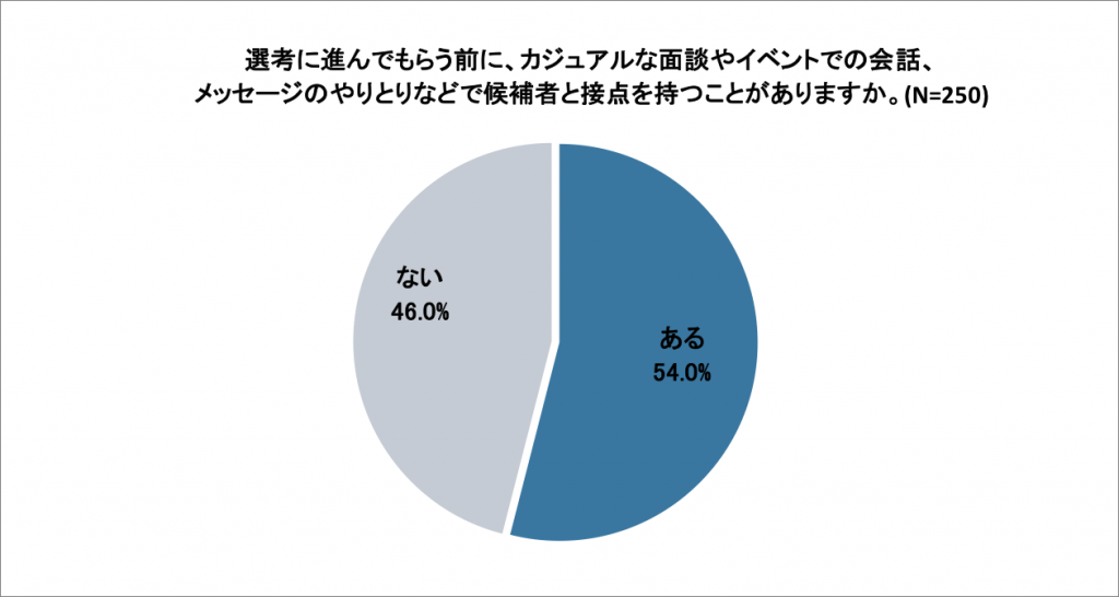 54.0%が選考前にカジュアル面談やイベントでの会話、メッセージのやりとりなどで候補者とコミュニケーションをとっていると回答しました。採用課題で顕著だった母集団形成を解決するために、自社に少しでも興味を持った人をより強く惹きつけて選考に乗るようにするという採用手法に変わっていっていると考えられます。
