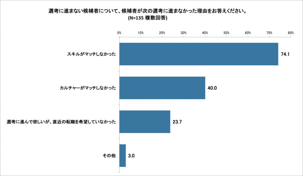 一方でカジュアル面談などを行う上でスキルやカルチャーがマッチしないことは多いようです。また、スキルやカルチャーがマッチしている場合でも「直近の転職を希望していなかったために選考に進まなかった」経験がある担当者は23.7%にのぼります。