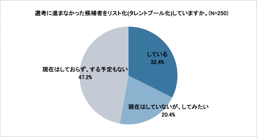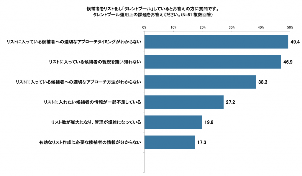 また、二番目に多かったのは「リストに入っている候補者の現況を窺い知れない」の46.9%でした。タレントプールに登録した候補者が現在転職を考えているのか、すでに他の会社に転職してしまっているのかなど直近の情報を把握できないことが問題になっているようです。