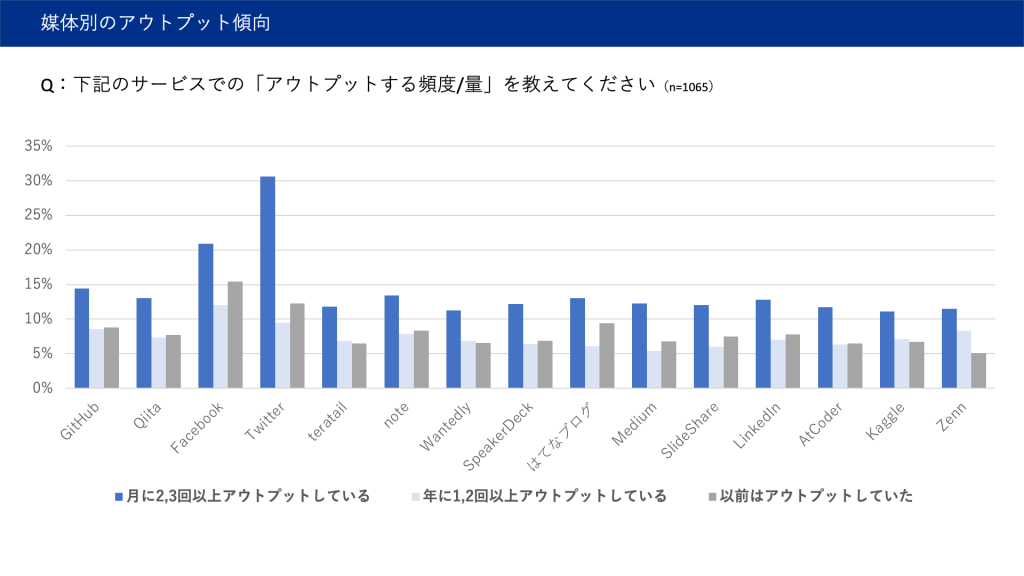 エンジニアがアウトプット対象のWEBサービスやSNS毎に、アウトプットする頻度や量を聞きました。その結果、Twitterが一番利用されていることが分かりました。エンジニアに特化したWEBサービスではGitHubでのアウトプットが一番多いことがわかりました。