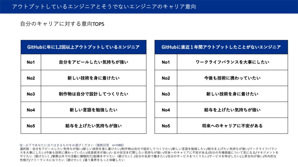 Web上にアウトプットをしているエンジニアと、していないエンジニアのキャリアに対する意向を聞きました。アウトプットをしているエンジニアの第一位が「自分をアピールしたい気持ちが強い」となった一方で、していないエンジニアは「ワークライフバランスを大事にしたい」となりました。