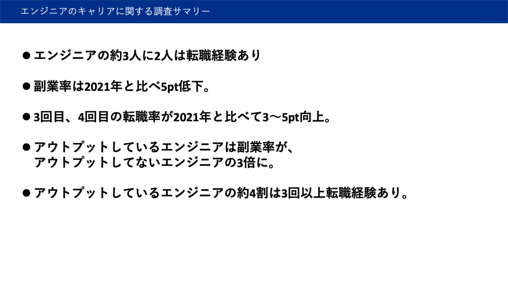 また、Web上にアウトプットをしているエンジニアと、していないエンジニアとでは、副業率、転職回数に差が表れていました。こちらも推測の域を出ませんが、たとえば、アウトプットをしている方はそれを通じてより多くのキャリアの機会を得ているのかもしれません。