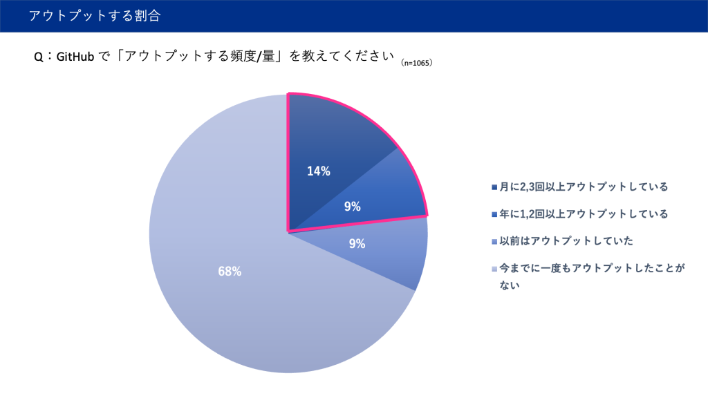 GitHub(*1)でアウトプットをしている頻度と量について聞きました。アウトプットを年1回以上している人たちが全体の23%を占めていることが判明しました。前年の2021年の調査時にはアウトプットを年1回以上している人たちは全体の24%でしたので、ほぼ横ばいとなりました。