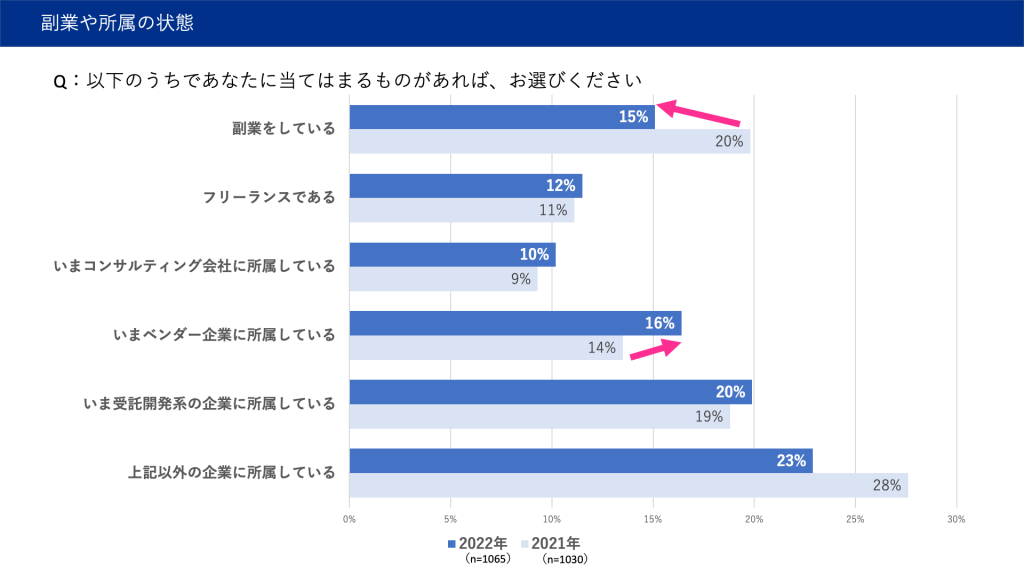 現在の所属状況について聞きました。副業している割合が、前年と比べて5pt低下し15%でした。ベンダー企業(WEBサービス運営会社)に所属している割合は前年より2ptアップし、16%でした。