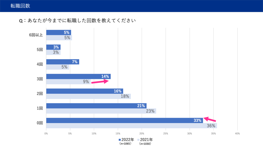 今までに転職した回数を聞いたところ、約7割近くの人が転職経験があるという結果が明らかになりました。昨年と比較すると、3回目の転職が5%、4回目の転職が2%上昇していることから、経験者の転職が多かったと考えられます。また、転職0回の割合が昨年よりも3pt減少したことから、2021年中に初めて転職を経験した人も増加したと思われます。