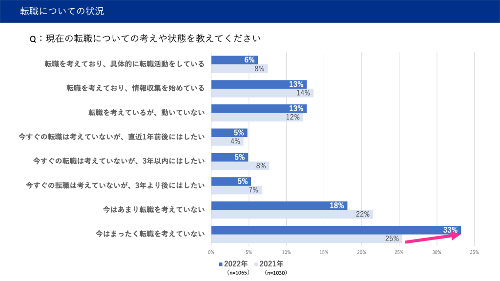 現在の転職状況について聞きました。「今はまったく転職を考えていない」と回答した人の割合が昨年より8pt増加しています。2021年に転職した方が多かったため、今現在は転職を考えていない方が増えたことが要因として考えられます。