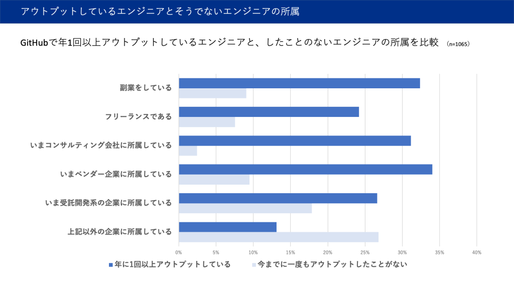 GitHubで年1回以上アウトプットしているエンジニアとしていないエンジニアの所属を比較した結果、副業率やフリーランス率がアウトプットをしたことがないエンジニアの約3倍となりました。アウトプットしているエンジニアは、コンサルティング会社や、ベンダー企業に所属している割合が高いことも特徴です。
