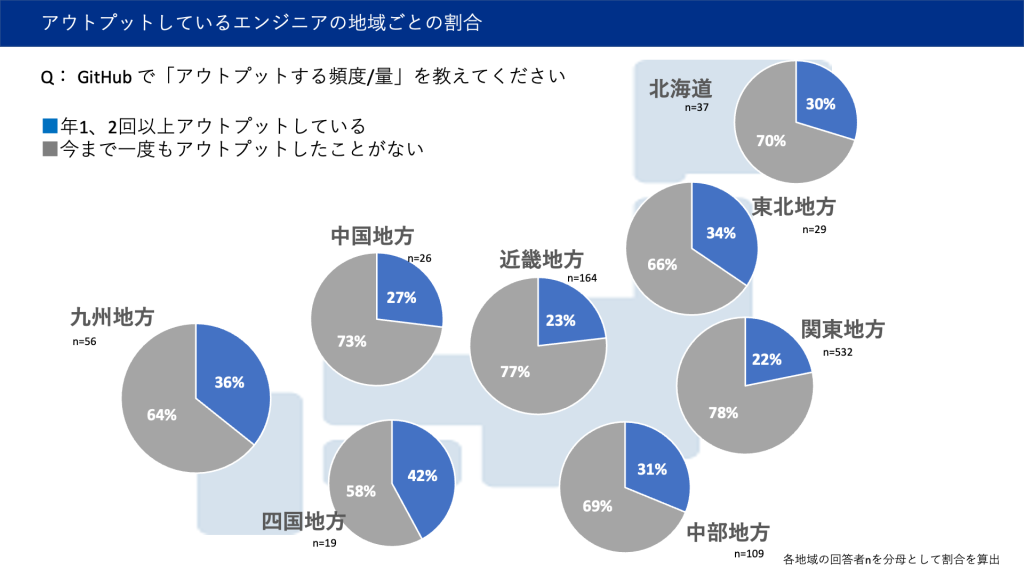 GitHubでアウトプットをしているエンジニアとしていないエンジニアを居住地域別に分析しました。アウトプットをしている割合は、関東地方や近畿地方といった都市部周辺よりも、他の地方にお住まいのエンジニアの方がアウトプットしているエンジニアが多い傾向が見られました。