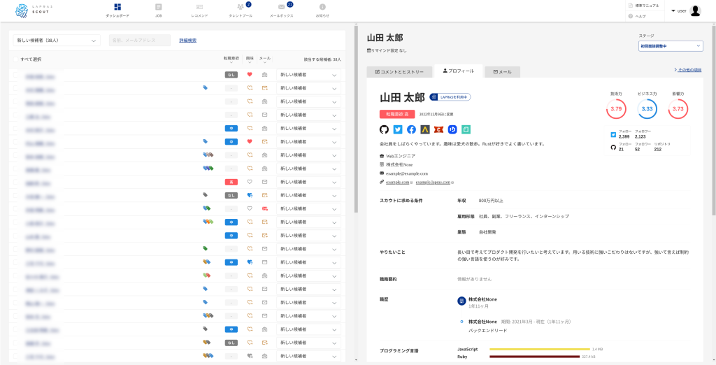 LAPRAS SCOUTはこれまで、候補者のスキルや活動を詳しく把握できるという特長により、企業が候補者にパーソナライズされたスカウトを送ることで、企業のエンジニア採用に貢献してきました。今回の機能により、より大人数の候補者への対応を簡単にするとともに、複数人での運用の効率を高めることでエンジニアの採用に貢献します。