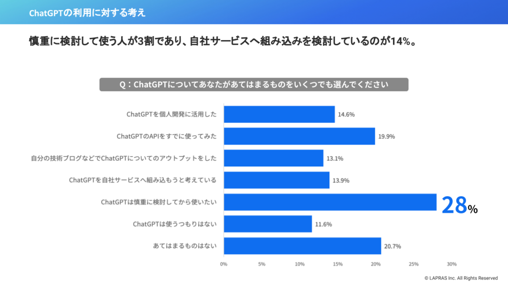 全体の3割が慎重に検討して使いたいと回答。ChatGPTを活用するために慎重に検討する姿勢が伺えます。