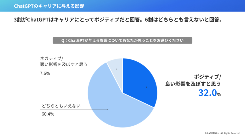 ChatGPTがキャリアに与える影響を聞いた結果、回答者の3割はポジティブに捉えていました。一方で6割はどちらともいえないという回答となり、まだ様子見が多い状況がわかりました。