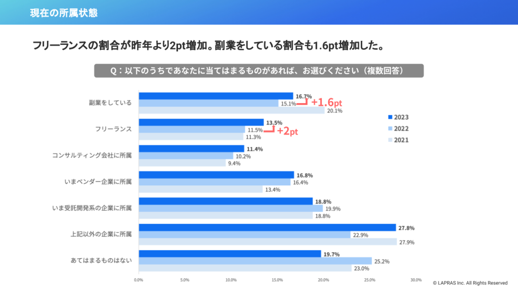 現在の所属について聞いた結果、昨年と比べフリーランスが2pt、副業が1.6pt上昇していました。副業やフリーランスとして活動するエンジニアが増加していることがわかりました。