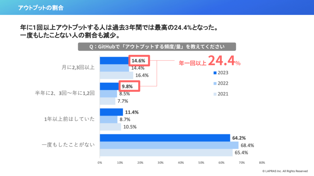 ・年に1回以上アウトプットするエンジニア(*1)の割合は過去3年間で最も高い24.4%となった。