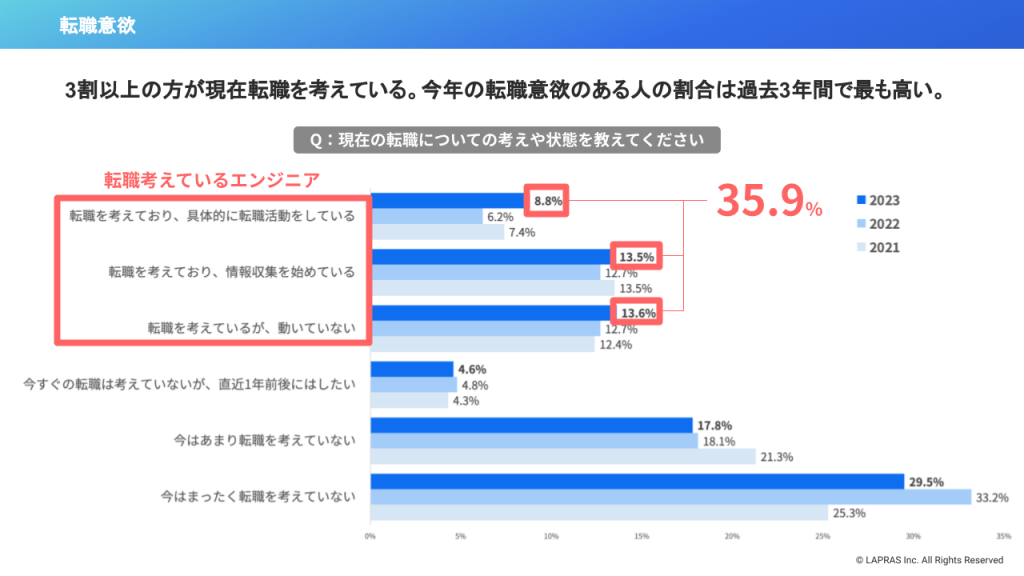 回答者全体の3割が現在転職を考えていると回答。過去3年間でも最も多い割合となり、エンジニアの転職意欲の高さが現れています。