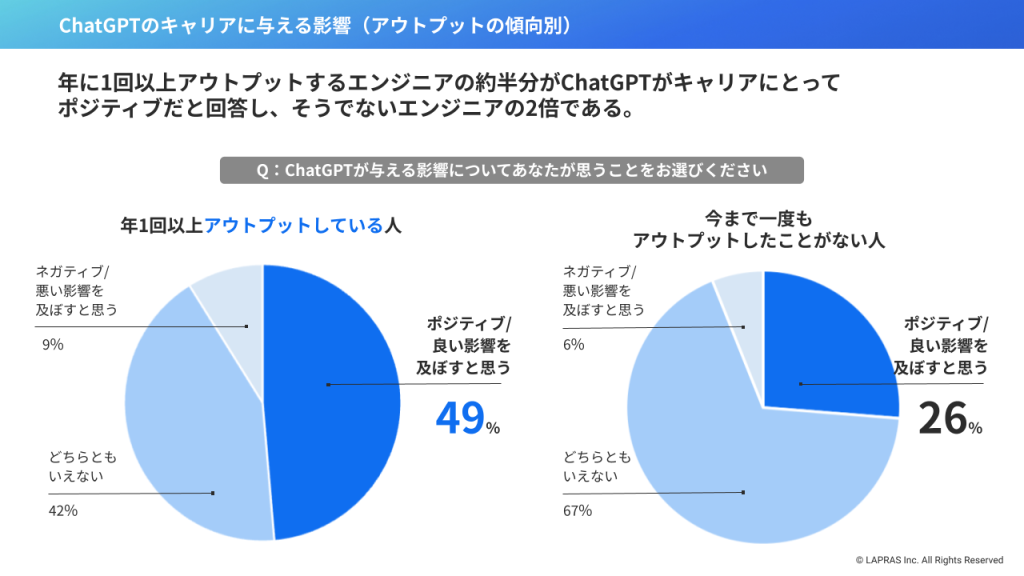 年一回以上アウトプットするエンジニアはChatGPTに対してポジティブな反応を示しており、アウトプットしたことのないエンジニアと捉え方の差が大きくでた結果となりました。