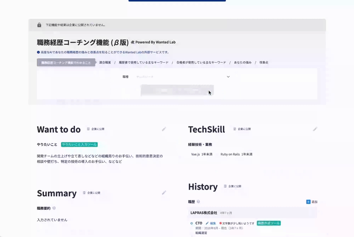 また、本機能はLAPRAS社と業務提携した韓国のHRテック企業Wanted Lab社が提供する機能をLAPRASのサービス内で提供するものです。韓国で300万人以上が利用するAIマッチング採用サービス「Wanted」を運営するWanted Lab社は、転職成功者に関する大量のデータを保有しており、「書類選考を通過しやすい」職務経歴書に対する知見があります。その知見を元にして開発されたAIが、より転職時に魅力的に伝わりやすい観点で職務経歴書にアドバイスをしてくれます。