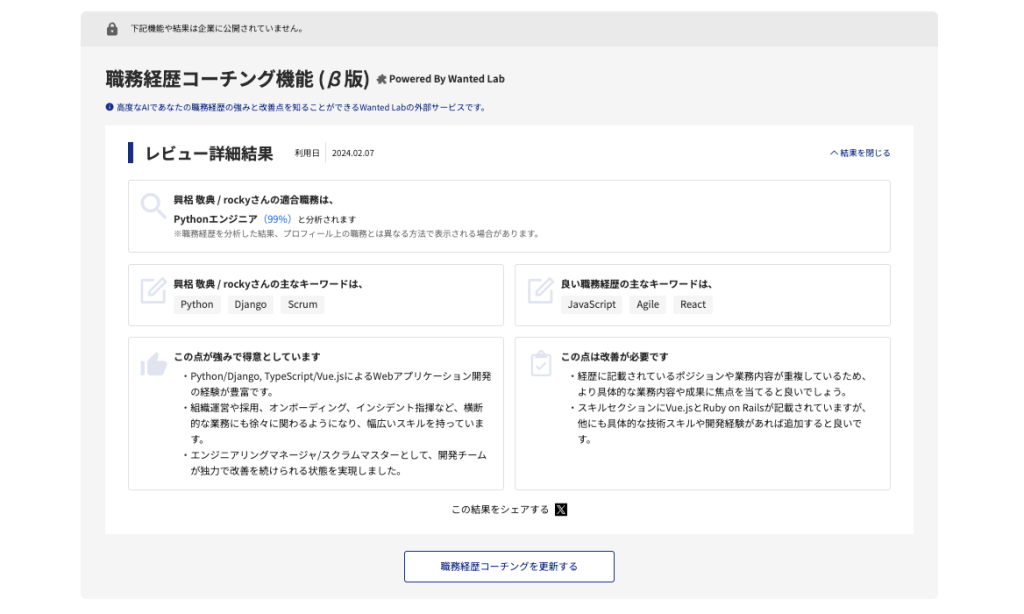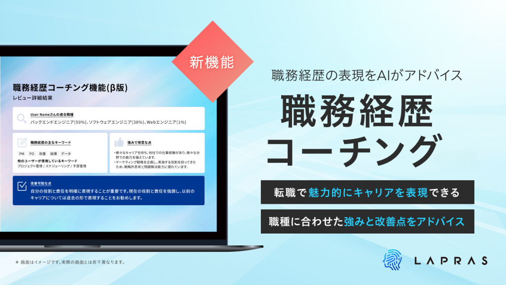 LAPRAS株式会社(所在地:東京都品川区、代表取締役:染谷健太郎 以下、LAPRAS社)は、キャリアパートナーサービス「LAPRAS」において、職務経歴書の改善点をAIが教えてくれる「職務経歴コーチング」の提供を始めます。本機能は、2023年11月に業務提携した韓国最大級のHRテック企業であるWanted Lab, Inc. (以下、Wanted Lab社)のAI技術を用いたものです。