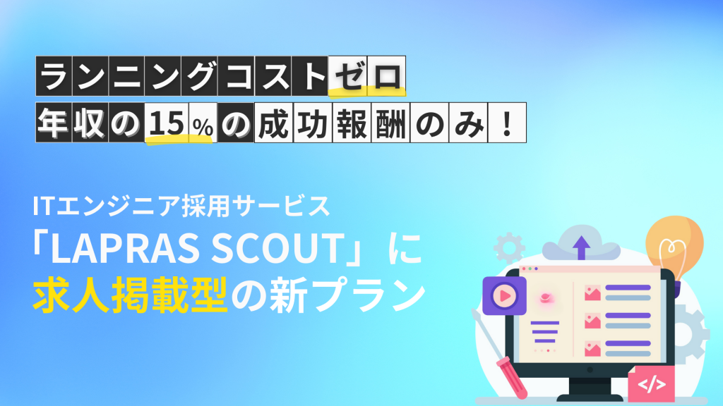 LAPRAS株式会社(所在地:東京都品川区、代表取締役:染谷健太郎 以下、LAPRAS社)は、AIスカウトリクルーティングサービス「LAPRAS SCOUT」にて、ランニングコストゼロ、成功報酬が年収15%のみで採用活動ができる、求人掲載型採用プラン「LAPRAS JOB BOARDプラン」の提供を開始します。企業は求人を掲載するだけで、簡単かつ安価にハイスキルエンジニアの採用成功が期待できます。