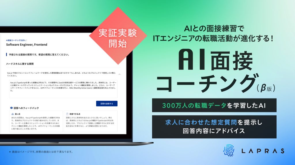 LAPRAS株式会社(所在地:東京都品川区、代表取締役:染谷健太郎 以下、LAPRAS社)は、キャリアパートナーサービス「LAPRAS」において、AIと面接練習ができる「AI面接コーチング(β版)」の実証実験を始めます。本機能は、AIが求人内容に合わせてカスタマイズした想定質問を行い、回答を即座に分析しアドバイスを提供するものです。2023年11月に業務提携した韓国最大級のHRテック企業であるWanted Lab, Inc. (以下、Wanted Lab社)が持つ300万人の転職データやAI技術を活用し、本格提供に向け、機能の一部を試験的に提供します。