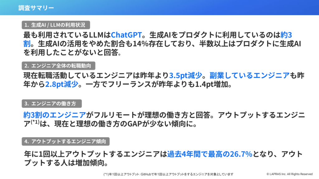 LAPRAS株式会社(所在地:東京都品川区、代表取締役:染谷 健太郎 以下、LAPRAS)は、日本国内在住ITエンジニア881人を対象としたキャリアとアウトプットなどエンジニアの実態に関する調査を実施しました。