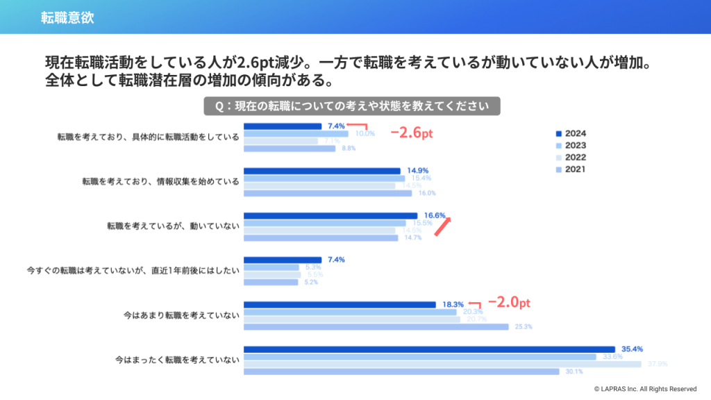 現在転職活動をしているエンジニアの割合が昨年より減少。一方で、今はあまり転職を考えていないエンジニアは4年連続で減少。転職を考えているが動いていないエンジニアが増加していることからも転職潜在層が増加している傾向がわかりました。