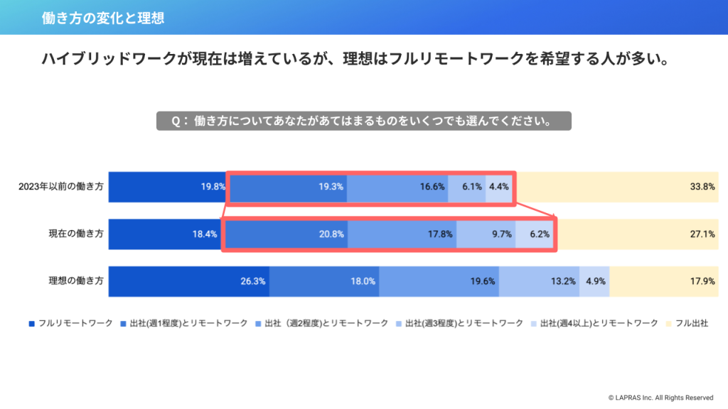 2023年以前と現在の働き方を聞いた結果、ハイブリッド(出社とリモートワークの組み合わせ)の働き方が増加していました。理想の働き方はフルリモートが最も多い結果となりました。