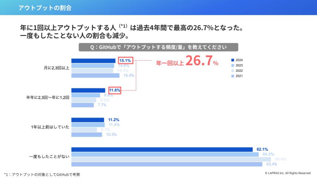 以下の調査結果における「年に1回以上アウトプットするエンジニア」は「GitHubに年1回以上アウトプットしているエンジニア」を対象としています。