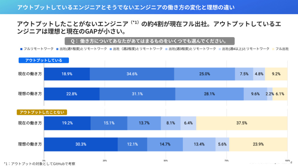 年一回以上アウトプットするエンジニアとそうでないエンジニアの働き方を比較した結果、アウトプットするエンジニアはハイブリットで働く割合が高く、理想と現在の働き方のGAPが少ない傾向がわかりました。